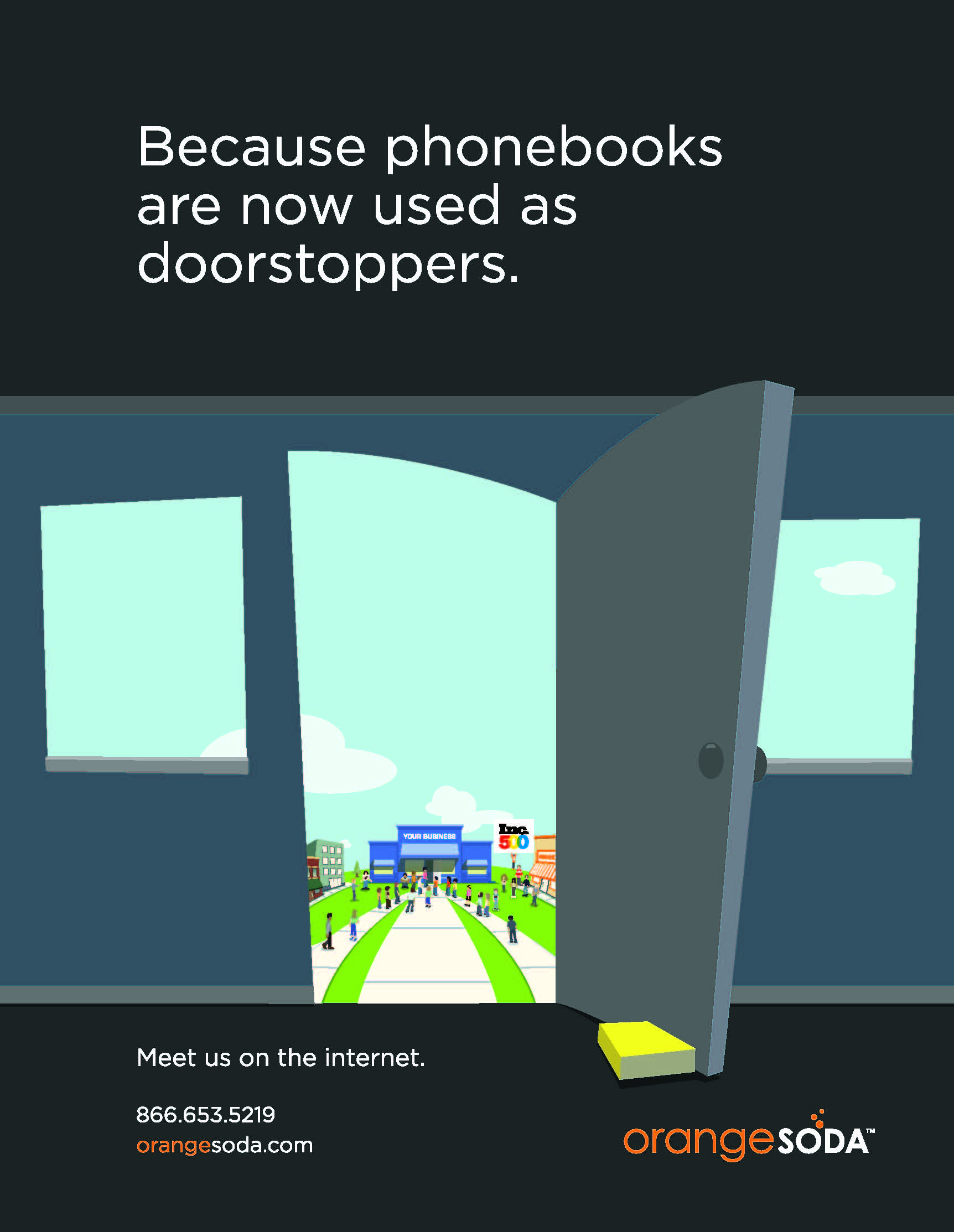 This was part of a branding campaign positioning OrangeSoda as the new way for businesses to succeed. The ad is meant to suggest that times have changed and people no longer use phonebooks to find businesses; they turn to the internet instead.